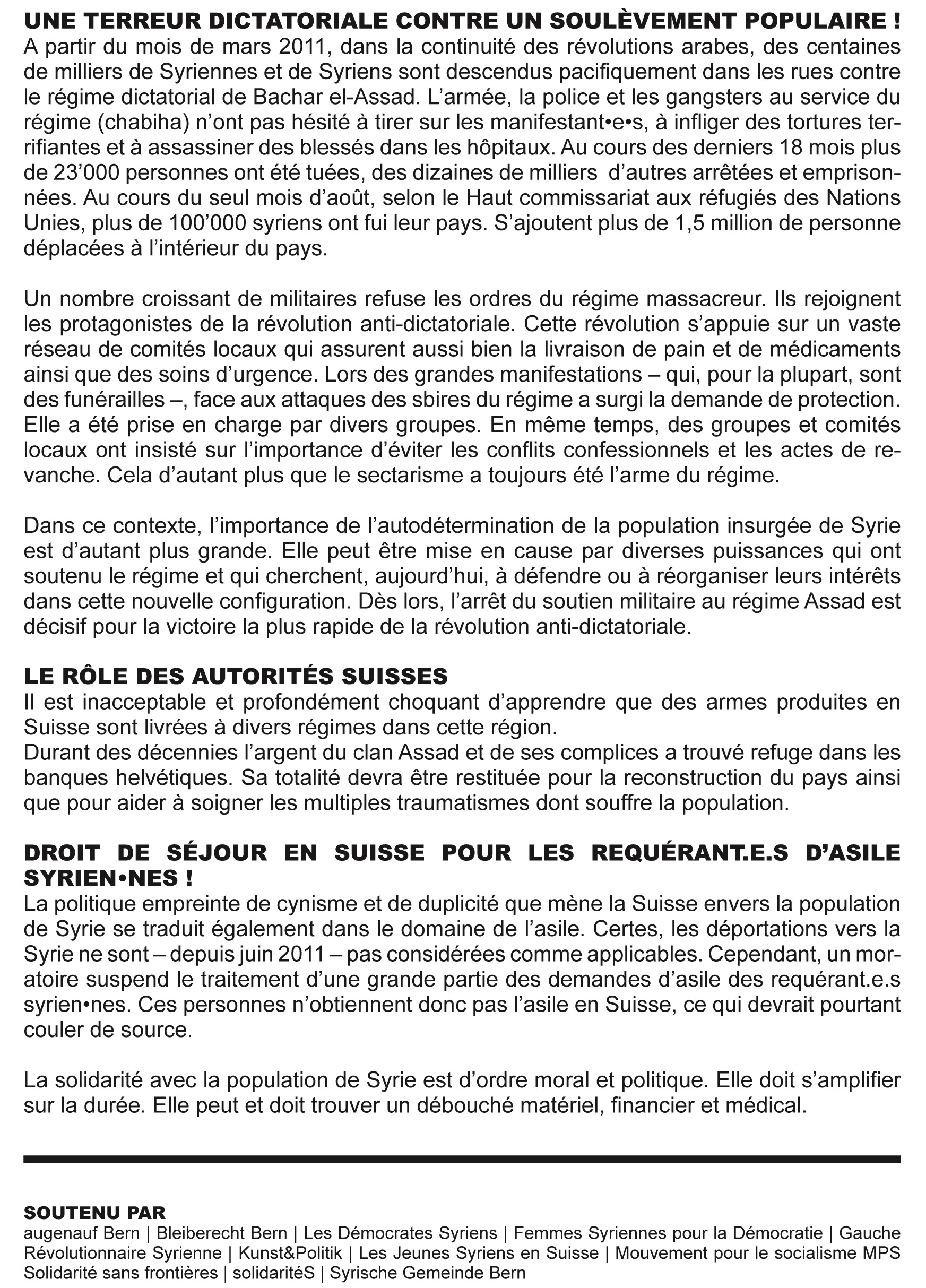 Manifestation de solidarité avec le peuple syrien insurgé, samedi 29 septembre, Berne