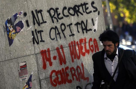En medio de un creciente descontento ciudadano por la persistencia de la recesión, duras medidas de austeridad para reducir el déficit público y una tasa de paro récord, España vivirá el miércoles su segunda huelga general en menos de un año con expectativas de un alto seguimiento. En la imagen, un hombre pasa por delante de un muro con pintadas llamando a la huega general en Madrid, 13 de noviembre de 2012. REUTERS/Sergio Perez